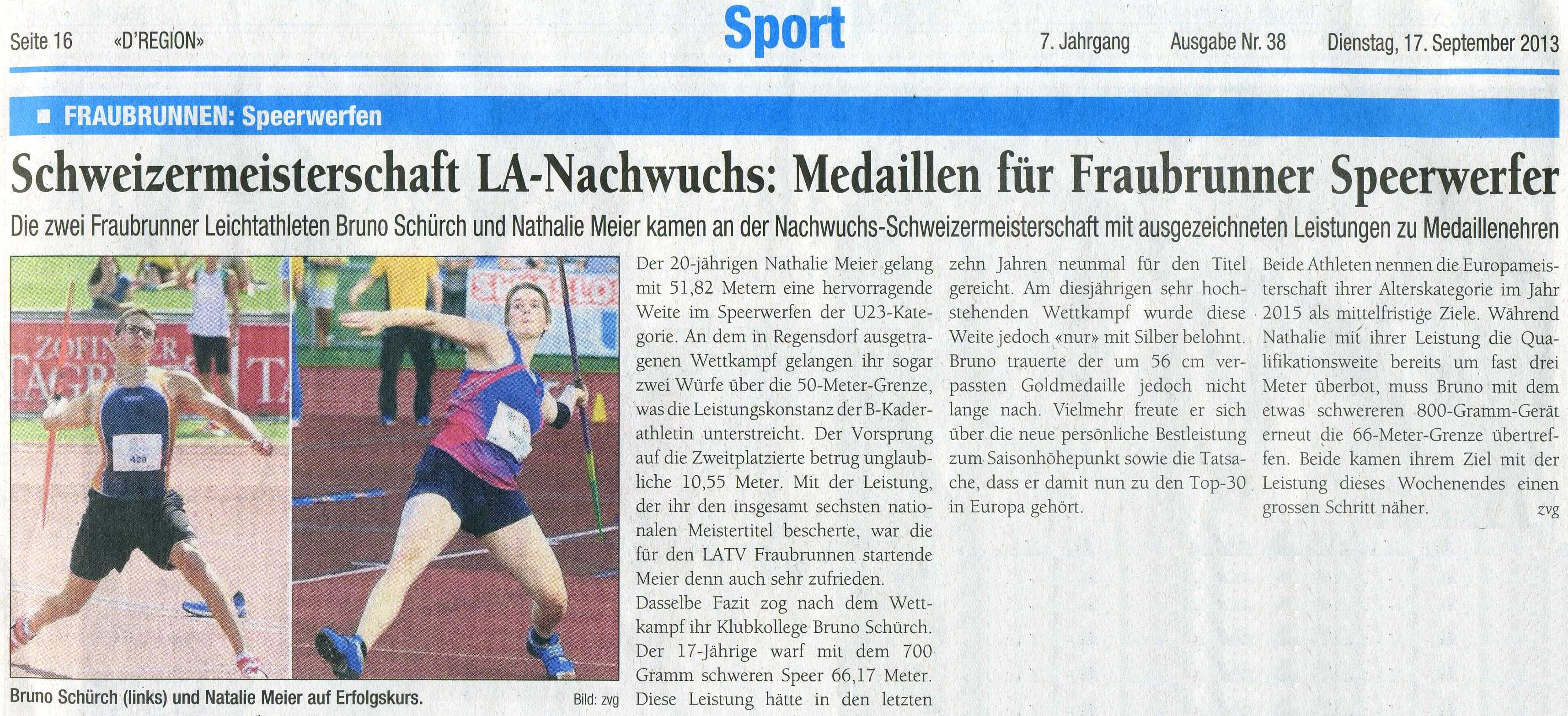 | 08.9.2013 - 20:11 Schweizermeisterschaft U18: 66.17m für Bruno Schürch